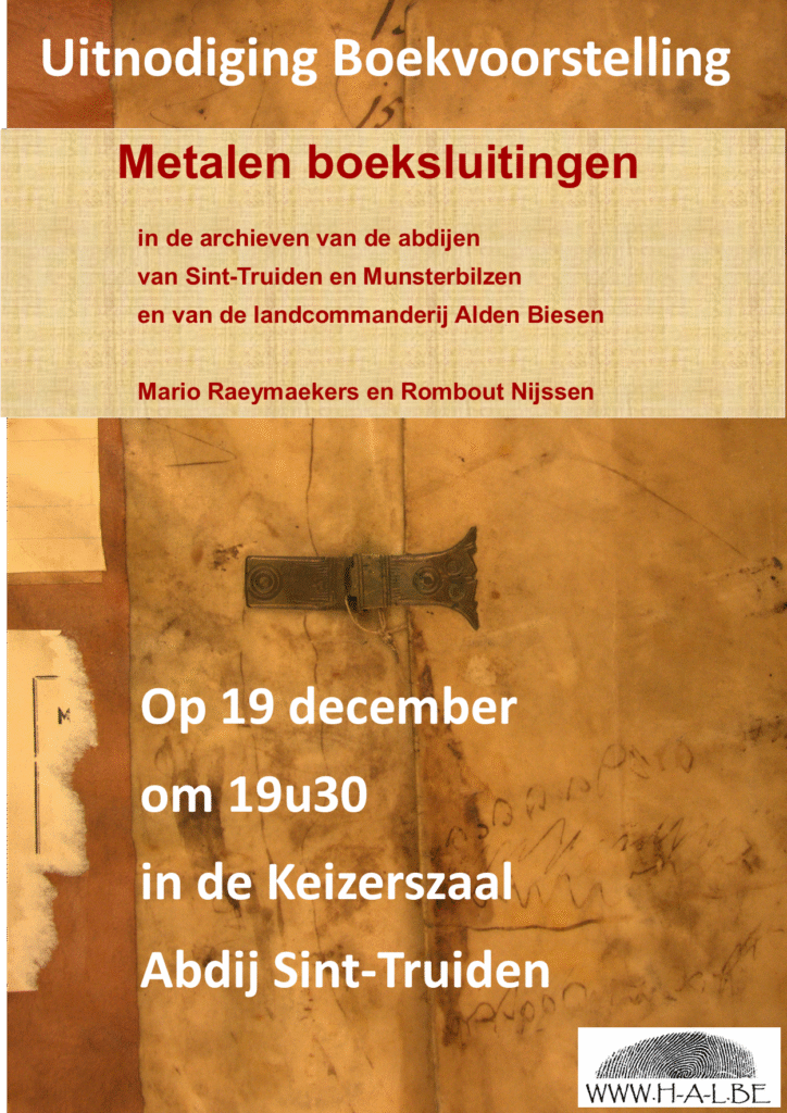 Onderdelen van metalen boeksluitingen bijvoorbeeld. Nu wil het geval dat het archief van de abdij veel registers met metalen boeksluitingen bevat. Op basis van de registers in het archief van de abdij van Sint-Truiden hebben Mario Raeymaekers en Rombout Nijssen van ASR een overzicht gemaakt van die sluitingen. Hun werk is bedoeld om metaaldetectoristen te helpen hun vondsten te identificeren.